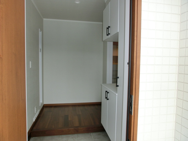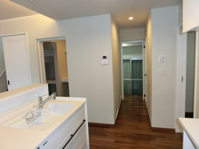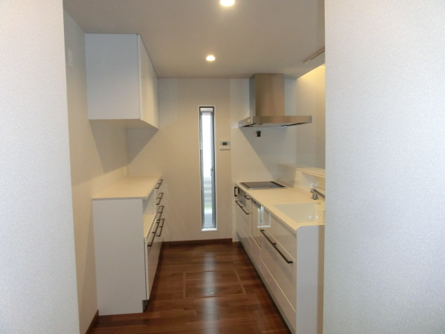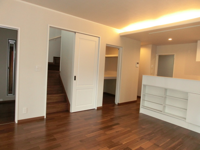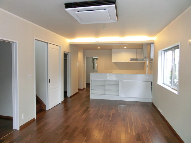 木目の美しいフローリングと白を基調とした内装が調和した、上品で落ち着きのあるLDK。天井に施された間接照明がやさしく空間を照らし、居心地の良い雰囲気を演出しています。 キッチンは清潔感のあるホワイトでまとめられ、収納力の高いカウンター収納も完備。使いやすさとデザイン性を兼ね備えたレイアウトで、毎日の家事も快適にこなせます。 大きな窓からは自然光がたっぷりと差し込み、日中は電気いらずの明るさ。住まい全体に開放感を与える、家族団らんにぴったりの住空間です。