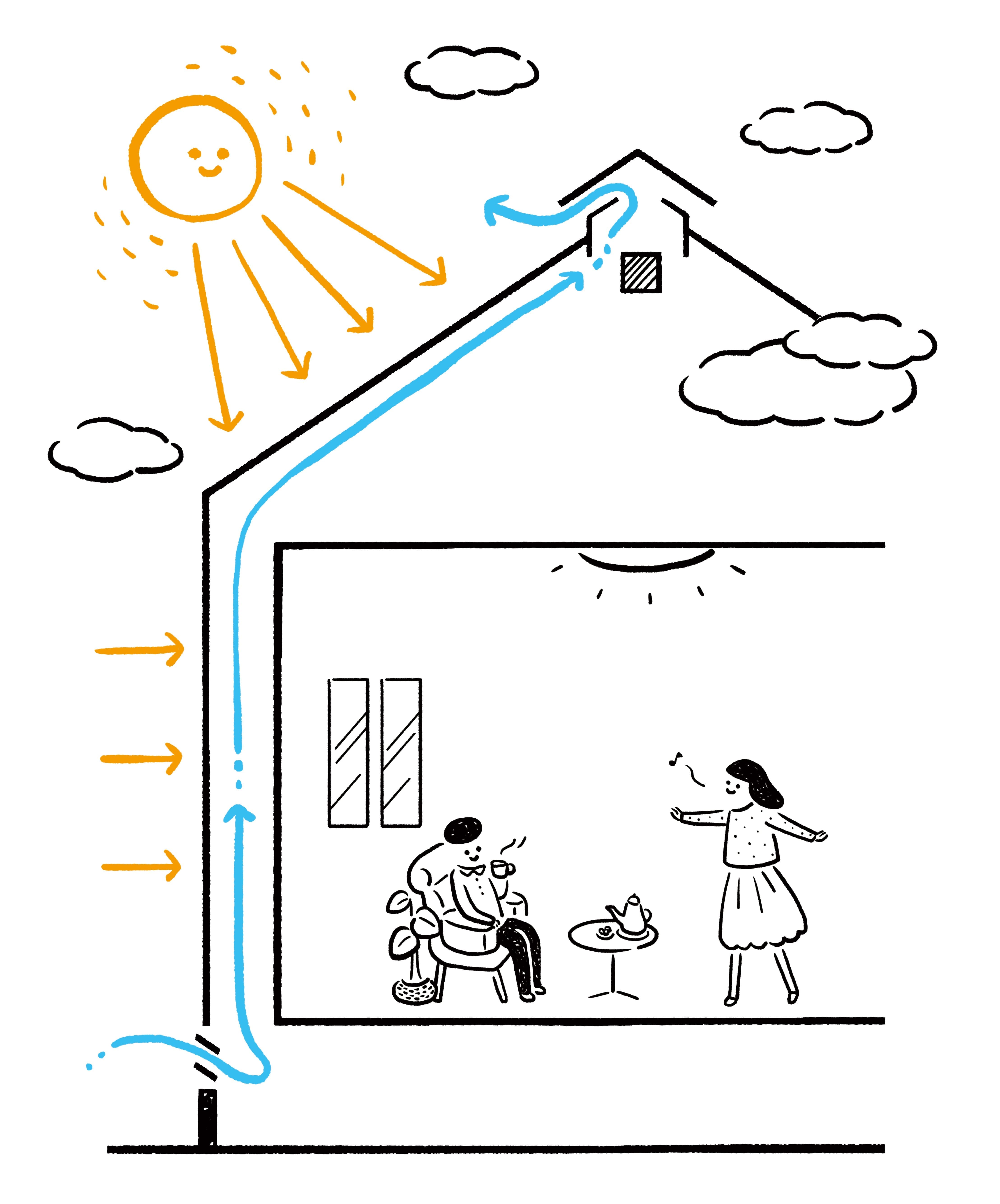 人は、暑くなれば服を脱ぎ、寒くなれば服を着こむことで、季節に適応します。同じように、家も季節に応じて自動的に「衣替え」できる仕組みを持てたら素晴らしいと思いませんか? 季節に応じて自然に空気の流れを調節し、家全体が快適な温度を保つ――これが「呼吸する家」と呼ばれる所以です。WB工法の家は、そこで暮らす人々に一年中快適な住環境を提供しながら、エネルギー効率の向上にも貢献しています。